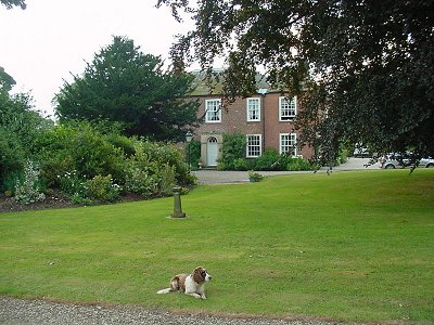 A dog lazes in front of the cottage itself | The spire of the meteorite monument is just barely discernible in the upper right, on the horizon to the left of the tree foliage |